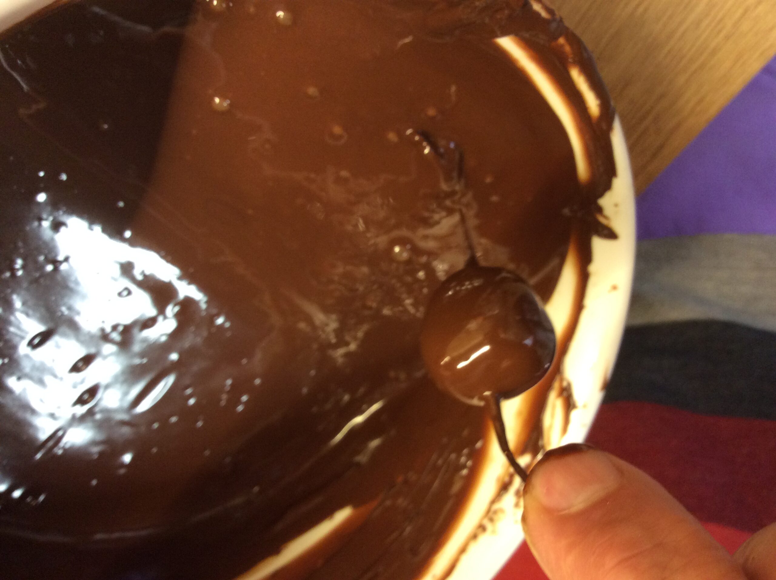 Die Kirschen am Stiel halten und in temperierte , dunkle Kuvertüre, zartbitter, tauchen. Das Vorbereiten der Kuvertüre wird in meinem Backblog unter " Pralinen " -Mandelsplitter- beschrieben.